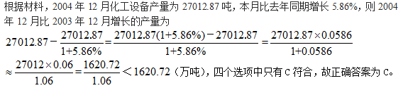 参考答案: D 本题解释:D.[解析] 本题主要考查计算比较能力。如果要计算每一年增长速度的话,计算量会很大,可以设置几个中间数值(10%、15%、20%),看每一年的增长速度介于哪两个数值之间即可,由此可判断出2004年增长速度最快>20%,所以选择D选项。