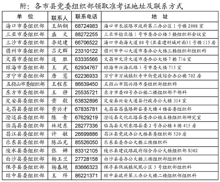 1、11月11日8:00至15日17:00,考生凭身份证到所报考市县党委组织部(具体领取地址及联系方式见附件)领取准考证,并按照准考证标明的时间、地点参加笔试。