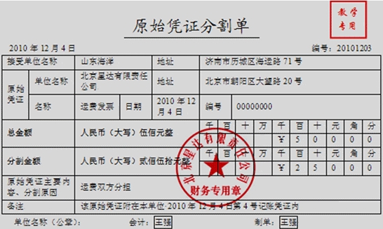 ⑷一张原始凭证所列的支出需要由几个单位共同负担时,应当由保存该原始凭证的单位开具原始凭证分割单给其他应负担的单位。