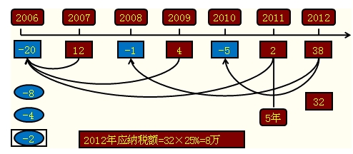 【例题·计算题】某企业2006年发生亏损20万元,2007年盈利12万元,2008年亏损1万元,2009年盈利4万元,2010年亏损5万元,2011年盈利2万元,2012年盈利为38万元。则该企业2006-2012年总计应缴纳的企业所得税税额是多少?(适用的企业所得税税率为25%)