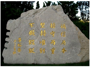 朱镕基同志在2001年视察北京国家会计学院时,为北京国家会计学院题词:“诚信为本,操守为重,坚持准则,不做假账。”