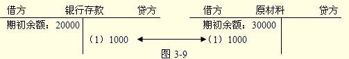 这项经济业务,使企业的材料增加1000元,同时使企业银行存款减少1000元,它涉及“原材料”和“银行存款”这两个资产类科目。材料的增加是资产的增加,应记入“原材料”科目的借方,银行存款的减少是资产的减少,应记入“银行存款”科目的贷方。这项经济业务在科目中登记的结果如图3-9所示。