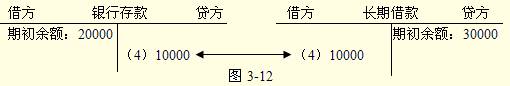 这项经济业务,使企业的银行存款减少10000元,同时使企业长期借款减少10000元,它涉及“银行存款”这个资产类科目和“长期借款”这个负债类科目。银行存款的减少是资产的减少,应记入“银行存款”科目的贷方,长期借款的减少是负债的减少,应记入“长期借款”科目的借方。这项经济业务在科目中登记的结果如图3-12所示。