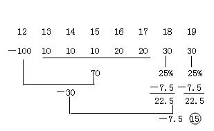 2012公司年亏损100万,从2013年开始盈利,13年赚10万,14年赚10万,15年赚10万,16年赚20万,17年赚20万,这五年总共赚了70万,弥补原来的亏损之后还剩30万的亏损。从第六年开始交税,18年赚了30万,交了7.5万的税,还剩下22.5万的利润,会计上可以税后补亏的,弥补原来30万的亏损,还剩7.5万的亏损。19年又赚了30万,交完7.5万的所得税之后,还剩下22.5万的利润,再次弥补亏损之前的7.5万的亏损,还剩下15万的净利润。