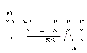 2012年公司亏损100万,2013年赚了40万,2014年赚了30万,2015年赚了20万,2016年赚了20万,2017年又赚了20万。 2013-2016年间赚了110万,期间赚到的100万是不需要交税的,2016年赚到的剩余的10万开始交税,所得税率是25%,2016年交所得税为2.5万,2017年交所得税5万。