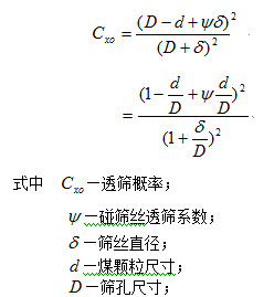 从以上公式可以看出,相对粒度越小,透筛概率越高。颗粒尺寸小,说明细小颗粒容易透过筛孔;而与筛孔接近或比筛孔大的煤,不易透过筛孔,这就是采用概率原理进行筛分的基本原理。