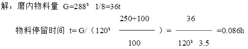 85、问答题 某厂水泥磨装载量为288t,台时产量为120t/h,磨内料球比为1:8,循环负荷率为250%,求物料在磨内停留的时间。