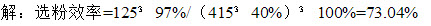 22、问答题 设选粉机的喂料量为415t/h,其中合格的细粉含量为40%,成品产量为125t/h,其中细粉占97%,求选粉效率是多少?