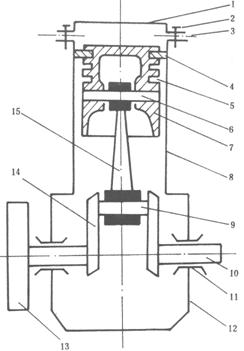 1-气缸盖;2-气缸盖螺栓;3-气缸垫;4-活塞环;5-活塞环槽;6-活塞销;7-活塞;8-气缸体;9-连杆轴颈;10-主轴颈;11-主轴承;12-油底壳;13-飞轮;14-曲柄;15-连杆。