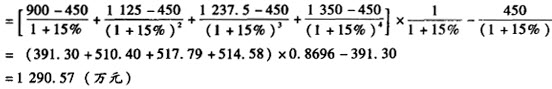 57、问答题 1993年购入一套设备,账面原值100万元,1996年花费4万元更新,1999年又用5万元改进其功能,预计尚可使用10年。该设备正常运作需要10人,年均工资6000元/人,材料消耗折合人民币100万元,能耗折合人民币10万元。目前的新式设备仅需7人,且料耗和能耗,均可节约10%。另外,从1993年至2001年间年物价上涨率10%,规模指数0.7,适用折现率8%,所得税率33%。(P/A,8%,10)=6.710 要求:根据以上资料估算该设备2001年的价格