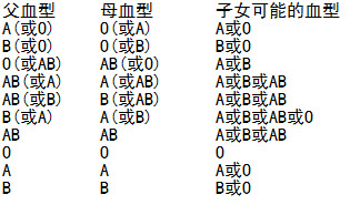 本题解析:试题答案ABO基因座位位于第九号染色体上(9q31.3-q34.1),有三个等位基因A、B、O。三等为基因有六种组合方式:AA、AO;BB、BO;OO;AB。相对应形成四种主要的血型A、B、O和AB。等位基因A和B控制红细胞和分泌物中A和B抗原的形成,而O基因不产生任何血型特征。