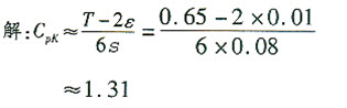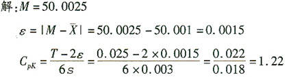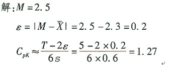 24、问答题 计算题:某工序加工一批零件,公差范围T=0.65mm,标准偏差s=0.08mm,尺寸中心与分布中心偏移量∑=0.01mm,求CPK