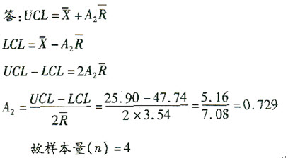 有一张现场工序质量控制图,由于染上油污,样本量(n)已经看不清楚,但其UCL=52.90,LCL=4774,平均极差R=3.54还是清晰可见。问:样本量(n)究竟是多少?