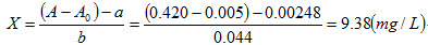按照《人造板及饰面人造板理化性能试验方法》(GB/T17657—1999),用40L干燥器法(乙酰丙酮分光光度法)测定某饰面人造板甲醛释放量时,取10ml待测吸收液,测得其吸光度为0.420,蒸馏水吸光度为0.005,校准曲线的回归方程为y=0.044X+0.00248(X为甲醛浓度,mg/L),求该饰面人造板甲醛释放量值。