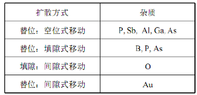C杂质浓度;D扩散系数(单位为cm2/s)J材料净流量(单位时间内流过单位面积的原子个数)解释:如果在一个有限的基体中杂质浓度C(x,t)存在梯度分布,则杂质将会产生扩散运动,杂质的扩散流密度J正比于杂质浓度梯度𝛛𝐂/𝛛𝐱,比例系数D定义为杂质在基体中的扩散系数。杂质的扩散方向是使杂质浓度梯度变小。如果扩散时间足够长,则杂质分布逐渐变得均匀。当浓度梯度变小时,扩散减缓。D依赖于扩散温度、杂质的类型以及杂质浓度等。