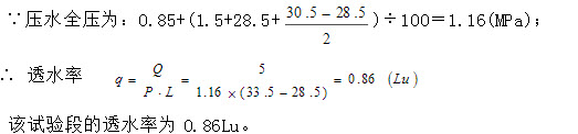 80、问答题 计算题:压水试验段位于(垂直孔)孔口以下28.5~33.5m;压水时的表压力为0.85MPa;压力表离地面1.5m;压入流量为5L/min;稳定地下水位在孔口以下30.5m处。请计算该试验段的透水率(Lu)。