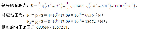 69、问答题 计算题:孕镶金刚石钻头单位底面积钻压宜为4~8MPa,当钻头外径为76mm,内径为60mm时,相应的轴压范围是多少?