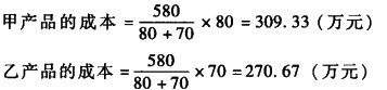 76、单项选择题 某公司生产联产品甲和乙。2014年5月份发生联合加工成本580万元,分别生产了80吨的甲产品和70吨的乙产品,若采用实物数量法,甲产品的成本为()万元。