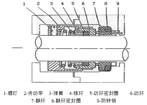 机械密封主要是靠安装在轴上的动环和安装在机械密封压盖上的静环间的两个光滑而平直的端面互相紧贴,并作相对转动而构成的密封装置。静环(非金属材料,一般用浸渍石墨或酚醛树脂等制成)安装在压盖上,中间用静环密封圈衬垫,起密封作用和避免偏斜的补偿作用,利用防转销将静环固定在压盖上,防止静环随着动环转动,动环(一般用硬材料,如高硅铸铁、堆焊硬质合金等。)是依靠弹簧压紧在静环上,工作面在工作过程中发生磨损时,可通过弹簧的作用,使动环和静环端面仍保持良好吻合,动环内有密封环,使动环与轴之间密封良好并可轴向移动,传动带用传动螺钉固定在轴上,调整它与弹簧的距离,可以调节弹簧的作用。