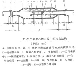 如下图,标出35kV交联聚乙烯中间接头结构的各部分名称及尺寸数据。