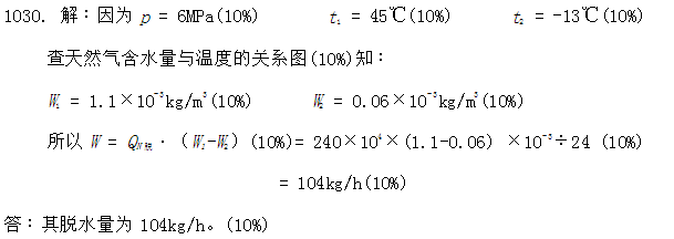 1、问答题 某净化厂脱水装置日处理脱硫气240×104m3,该脱硫气压力为6MPa,温度为45℃(饱和),要求脱水后净化气的露点为-13℃(压力6MPa下),求脱水量。