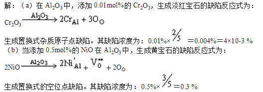 一块金黄色的人造黄玉,化学分析结果认为,是在Al2O3中添加了0.5mol%NiO和.02mol%Cr2O3。试写出缺陷反应方程(置换型)及化学式。