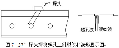 5、问答题 绘出37°探头探测钢轨螺孔上斜裂纹的回波显示图及探头位置图。