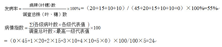 计算题:水稻稻瘟病田间调查数据如下,计算发病率及病情指数。