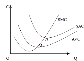 短期边际成本曲线SMC与短期平均可变成本曲线AVC相交于平均可变成本曲线的最低点