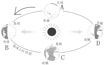 (4)当北极圈出现极昼时,地球的位置应在______处(填字母).