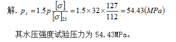 175、问答题 计算题:有一碳素钢高压管道,工作温度为250℃,工作压力为32MPa。求其水压强度试验压力([σ]25=112MPa,[σ]=127MPa)。