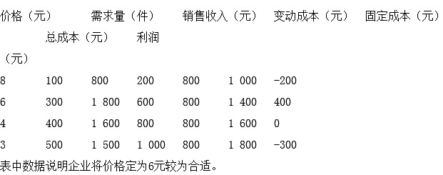 固定成本为800元,平均变动成本为一常数2元。试确定企业产品的价格多少较为合适?
