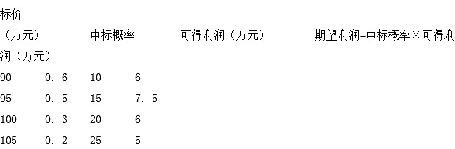从表中可见,报价95万元的期望利润最大,即7.5万元,意味着中标概率与玎得利润二者综合效果最好,按期望利润最大原则,企业应选择报价95万元。