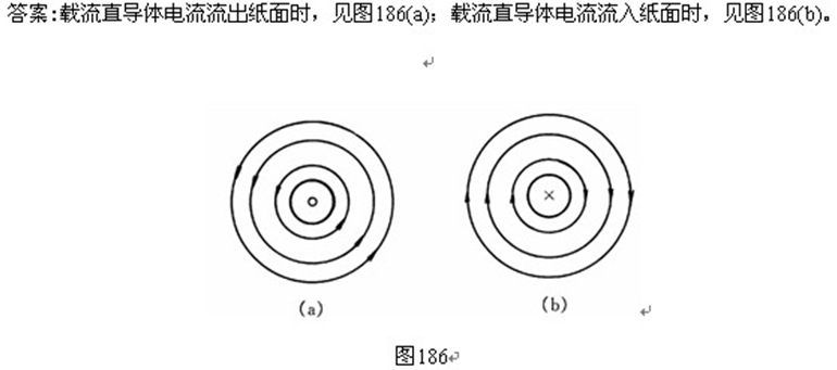 196、问答题 画出一个载流直导体及其周围磁力线方向的示意图。
