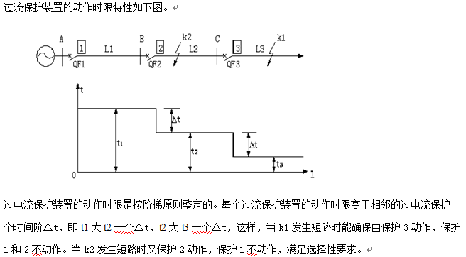 如下图所示为单侧电源辐射型电网中过流保护的配置,1、2、3为过流保护装置,请绘出保护装置的动作时限特性,并说明如何满足保护的选择性。