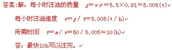 1、问答题 一台变压器需要注油量m为50t,采用两真空净油机进行真空注油,注油速度v为5.5m3/h,最快多长时间可以注满(油的比重ρ为0.91t/m3)?