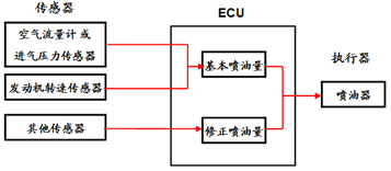 控制原理:ECU根据空气流量计信号和发动机转速信号确定基本喷油时间,在根据其他传感器对喷油时间进行修正,并按最后确定的总喷油时间向喷油器发出指令,使喷油器喷油或断油。