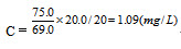 气相色谱法分析某废水中机组分时,取水样500ml以有机浴剂分次萃取,最后定容至25.00ml供色谱分析用,进样5ul测得峰高为同烟75.0mm标准液峰高69.0mm,标准液浓度20.0mg/L,试求水样中被测组分的含量(mg/L)