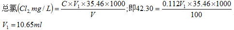 用碘量法测定某水样中总氯,取样体积为100ml,测得结果为42.30mg/L,问滴定时消耗了0.0112mol/L的硫代硫酸钠标准溶液多少毫升?(MCl=35.46)