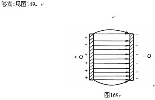 6、问答题 画出两块分别带有正、负电荷的平板平行放置时,两平板之间的电力线的分布图。