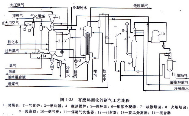 第一阶段为吹风阶段:吹入空气,提高燃料层的温度,空气由阀门1进人发生炉,燃烧后的吹风气由阀门4、5后经过烟囱排出,或去余热回收系统。