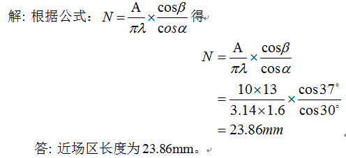 13、问答题 计算题:求折射角为37°斜探头在钢中的近场区长度。(已知λ=1.6mm、α=30°、晶片尺寸为10mm×13mm)。