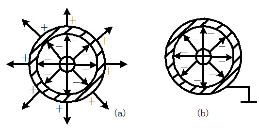 识绘题:下图在空腔中放一带正电的导体,分别标出空腔金属外壳接地和不接地情况下空腔内外表面感应的电荷以及电力线方向。用+号表示正电荷,—号表示负电荷。
