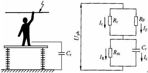 180、问答题 识绘题:画出中间电位作业的示意图和等值电路图,图中:R1、R2为两部分绝缘工具(或绝缘子串)的绝缘电阻,C1、C2为人体对带电体和接地体的电容。