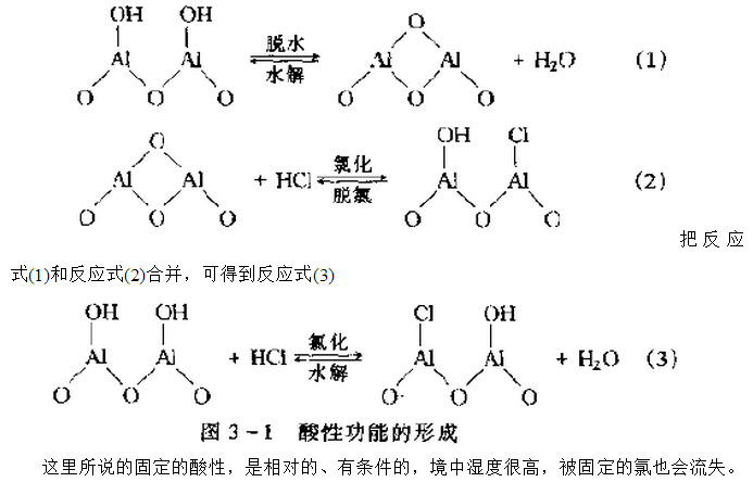 载体(γ-Al2O3)表面具有一定数量的羟基,在一定的条件下,可以部分脱水而生成氧桥;氧桥又可以与环境气氛中的HCl发生交换反应。使氯被固定在载体表面上