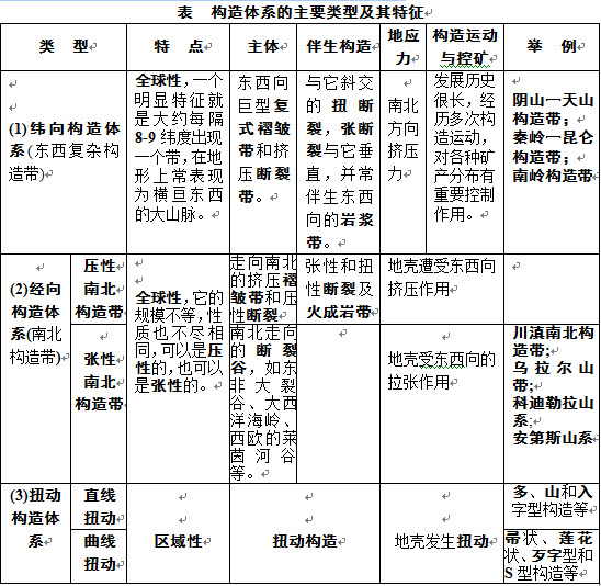 本题解析:试题答案由于构造应力场的不同,构造体系便有各种类型,目前已确定的可概括划分成三大类,即纬向构造体系、经向构造体系和扭动构造体系(下表)。