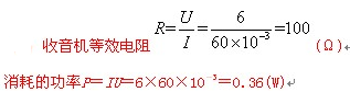 184、问答题 某一晶体管收音机,电源电压U为6V,开机后总电流I为60mA,试计算收音机的等效电阻和耗用功率。