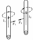 21、问答题 画出两根平行直导线,当同一方向流过电流时,导线受力的方向示意图。