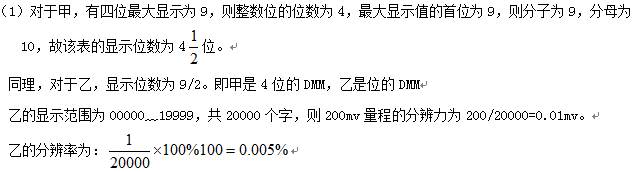 29、问答题 甲、乙两台DMM,甲显示器显示的最大值为19999,问: (1)他们各是几位的DMM?(2)若乙的最小量程为200mV,其分辨率为多少?