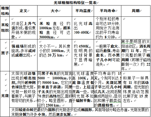 本题解析:试题答案太阳外部构造包括光 球、色球、日冕3个部分,其中光球又可以细分出米粒组织、黑子和光斑等精细结构,各结构特征见下表。